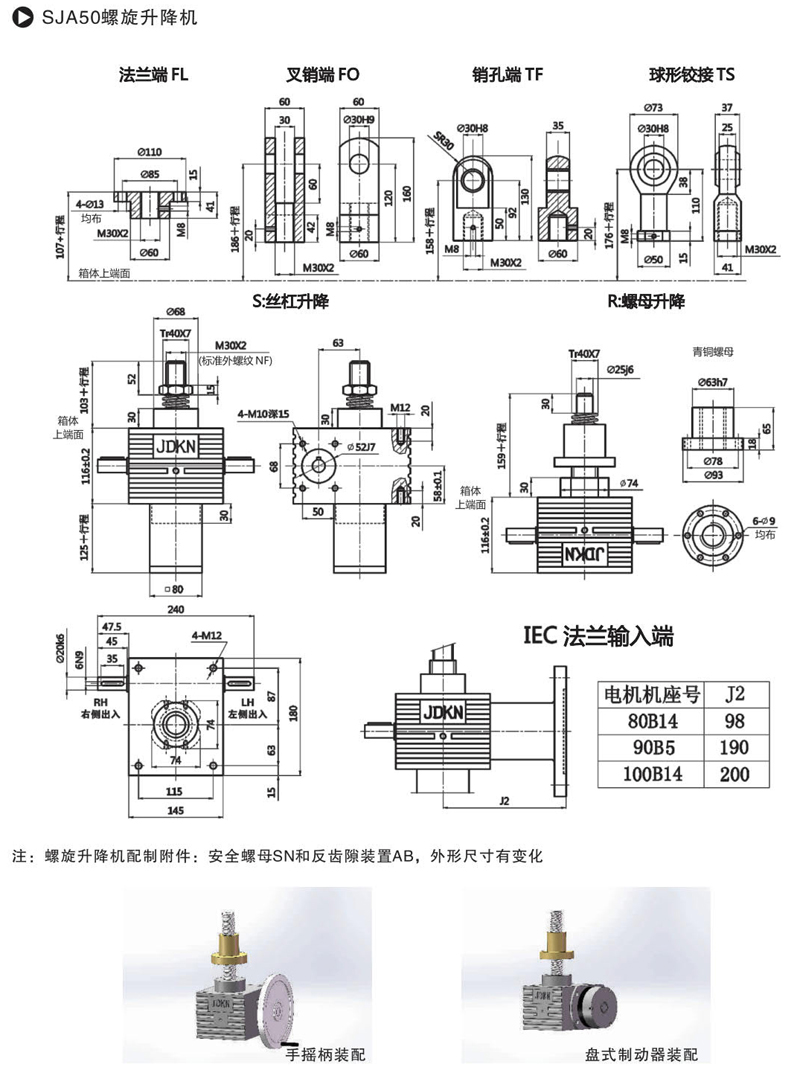 SJA螺旋升降機又稱SJA絲杠升降機,本產品是一種超重部件,可起升、下降及借助附件實現推進、翻轉及各種高度位置調整等功能。結構及裝配形式可選,可按客戶要求定制,安裝方便、使用靈活、功能多、配套及形式多、可靠性好、使用壽命長等優點。